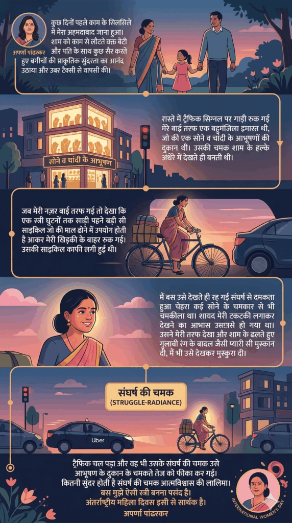 कुछ दिनों पहले काम के सिलसिले में मेरा अहमदाबाद जाना हुआ। शाम को काम से लौटते वक्त बेटी और पति के साथ कुछ सैर करते हुए बगीचों की प्राकृतिक सुंदरता का आनंद उठाया और उबर टैक्सी से वापसी की। रास्ते में ट्रैफिक सिग्नल पर गाड़ी रुक गई मेरे बाई तरफ एक बहुमंजिला इमारत थी, जो की एक सोने व चांदी के आभूषणों की दुकान थी। उसकी चमक शाम के हल्के अंधेरे में देखते ही बनती थी। जब मेरी नज़र बाई तरफ गई तो देखा कि एक स्त्री घुटनों तक साड़ी पहने बड़ी सी साइकिल जो की माल ढोने में उपयोग होती है आकर मेरी खिड़की के बाहर रुक गई। उसकी साइकिल काफी लदी हुई थी। मैं बस उसे देखते ही रह गई संघर्ष से दमकता हुआ चेहरा कई सोने के चमकार से भी चमकीला था। शायद मेरी टकटकी लगाकर देखने का आभास उसे हो गया था। उसने मेरी तरफ देखा और शाम के ढलते हुए गुलाबी रंग के बादल जैसी प्यारी सी मुस्कान दी, मैं भी उसे देखकर मुस्कुरा दी। ट्रैफिक चल पड़ा और वह भी। उसके संघर्ष की चमक उसे आभूषण के दुकान के चमकते तेज को फीका कर गई। कितनी सुंदर होती है संघर्ष की चमक आत्मविश्वास की लालिमा। बस मुझे ऐसी स्त्री बनना पसंद है।
